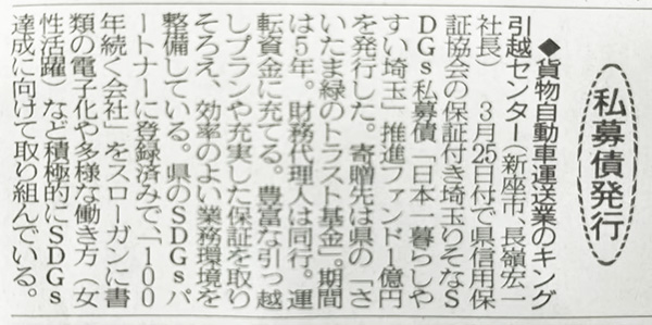 埼玉りそな銀行の保証付SDGs私募債『日本一暮らしやすい埼玉』1億円発行について埼玉新聞の記事に取り上げられました。寄贈先は県の「さいたま緑のトラスト基金」。埼玉県のSDGsパートナーにも登録。書類の電子化や多様な働き方を推進し今後もSDGsに取り組んでいきます。